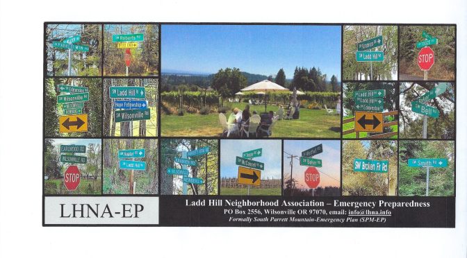 Through the efforts of volunteers, the Ladd Hill Neighborhood Association (LHNA) is working on creating the Ladd Hill Neighborhood Association – Emergency Plan (known as LHNA-EP) to assist in a disaster. LHNA-EP will provide us an immediate course of action until public services are able to reach our area using the volunteer manpower and resources of our neighborhood.